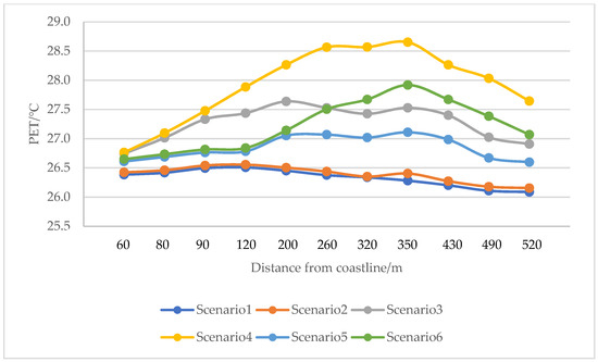 A scatter plot was drawn for the average PET in the interval of the aforementioned height position according to different simulation scenarios (Figure 11), where the abscissa was the average distance between the site and the shoreline. It should be noted that the 120 m distance from the coastline is basically the boundary between coastal green space and residential area in the study area. As a large number of buildings in the residential area would have a great impact on the thermal environment, the site was divided into two parts to analysis: coastal green space and residential area. In the coastal green space, that is, within the range of less than 120 m from the coastline, the PET of all scenarios increased with the increase of distance. In residential areas, the PET in Scenario 1 tended to decrease with increasing distance from the coastline. The PET in Scenario 2 was almost the same, but there was a lift at the distance of 350 m. The PET in Scenario 3 and 5 showed a rising-falling-rising-falling state with 200 m and 350 m as the boundary. The PET in Scenarios 4 and 6 showed a trend of rising first and then falling with 350 m as the boundary. This showed that the ocean has obvious cooling effect in the urban space of coastal slope topography. However, under the combined action of topography, elevation and planting, this cooling effect had a certain range of action. Overall, the PET increased with increasing distance from the shoreline in coastal green areas, whether lawns or trees were planted. In the residential area, with 350 m as the boundary, the PET showed a trend of rising first and then falling.