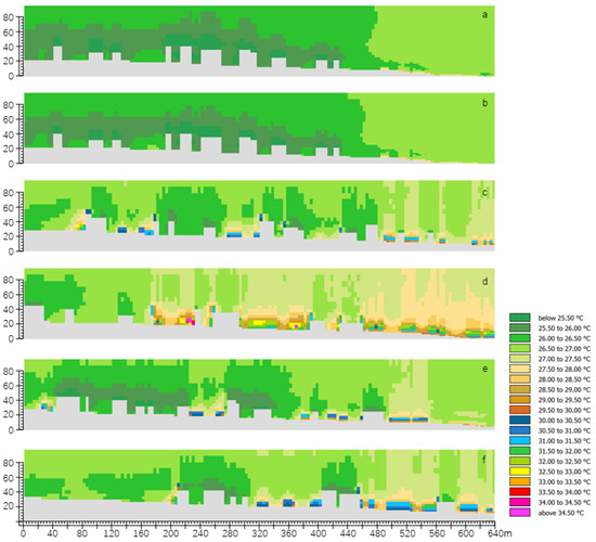 The east–west section of the highest PET position at 15:00 in the six scenarios is shown in Figure 10. The x value in the illustration is the abscissa of the maximum PET value, and the h value is the ordinate. Figure 12a,b shows that the highest PET in Scenarios 1 and 2 was in the same position. The location is in a coastal green space with a building shield less than 5 m above the sea breeze, and its rear topographic slope is nearly 50%. In both scenarios, the overall vertical distribution of low PET values formed by the buildings in the residential area was not very different, but in Scenario 2 with street trees, the area of high PET near the ground formed by the buildings and trees together was larger than that in Scenario 1. Figure 12c shows that the highest PET in Scenario 3 was located at 32.5 m in the shade of a building with flat terrain behind it, adjacent to the city road. Figure 12d shows that the highest PET in Scenario 4 occurred to the back of a 22.5 m building, which was under a dense tree canopy and adjacent to the road. Figure 12e shows the highest PET in Scenario 5 at 32.5 m, which was located to the back of a building, with a topographic slope to the rear of about 8%. Figure 12f shows that the highest PET in Scenario 6 was located at 25.5 m in the shade behind a building with a rearward terrain slope of about 12%.