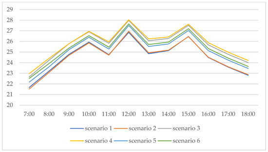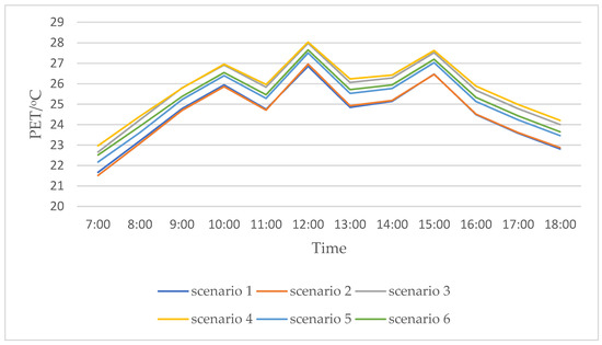 The average PET for the six scenarios from 7:00 to 18:00 was also analyzed in this study. According to the statistical data here, we can see that Scenarios 1 and 2 had the lowest average PET at each statistical time node during the day. The average PET of Scenario 1 was higher than that of Scenario 2 before 11:00, but vice versa after 12:00. The average daily PET of the other four scenarios showed a consistent change rule. Overall, the order of PET from low to high was Scenario 5 < Scenario 6 < Scenario 3 < Scenario 4 (Figure 13). Scenario 4 was significantly higher than other scenarios in terms of the distribution of the average PET throughout the day.