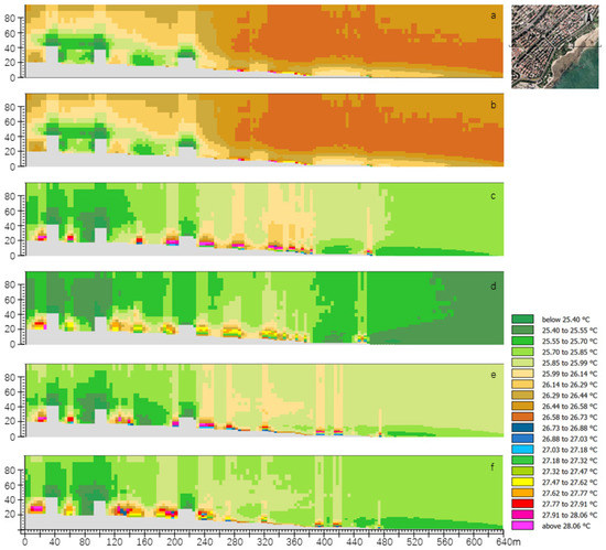 To show the vertical distribution of PET in the coastal tourist area, Figure 15 depicts the east–west profile of the coastal central square. The horizontal range of 388–456 m in the figure is the central square area. The PET distribution in this area is described below. It can be seen that the pedestrian height in the square area in Figure 15a,b is in the low and homogeneous PET range, about 26–26.1 °C. Figure 15c,d also shows a relatively low PET distribution in this region, between 26.5 °C and 26.8 °C for Scenario 3 and between 26.7 °C and 27.2 °C for Scenario 4. Figure 15a–d shows that if there is a slope facing the sea breeze in the square area, this can produce a low temperature area at pedestrian height, and the closer to the ground and the center of the square, the lower the PET. When planted on slopes, the cooling effect of lawns is better than that of trees. With an increase in the LAI of trees, the warming effect on the square may be enhanced. Figure 15e,f show that the square’s PET range in Scenario 5 was 26.6–28.9 °C and that in Scenario 6 was 26.7–29.2 °C. Hotter areas are generated below the canopy. Therefore, planting trees in the square will produce a local high PET under the canopy, and the higher the tree LAI, the more obvious the warming effect.