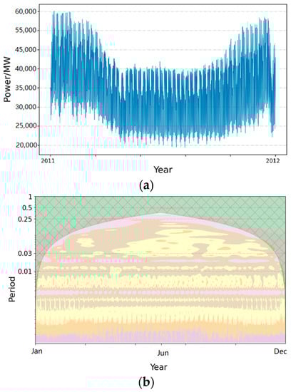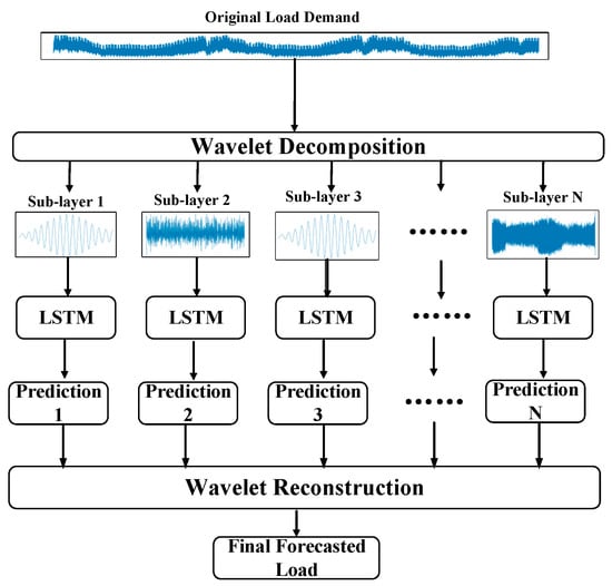 However, as discussed above, it is vital to create a precise prediction for the distribution network. The high uncertainty of the distribution network and the strict limitation of the traditional time-domain STLF model are the main barriers for researchers to improve the accuracy further. Hence, this paper proposes a hybrid STLF method that can extract both time-domain and frequency-domain features with high adaptivity. Time—frequency transformation approaches, such as the Fourier transform, wavelet transform (WT), and least-squares wavelet (LSW) [], can effectively convert the data from the time domain into the frequency domain. The literature proposes a hybrid STLF approach that combines the WT and ANN [,,,,]. In these works, the original time-series demand load is transferred into the frequency-domain data, then a series of neural networks are trained simultaneously to forecast each frequency component. Finally, the predicted values of all the components are combined to create the overall prediction of the demand load. However, there is a lack of work to take advantage of all the WT algorithms, which can improve the prediction accuracy further. As illustrated, a wealth of work is available in the literature and the existing STLF models still have some knowledge gaps that can be filled.