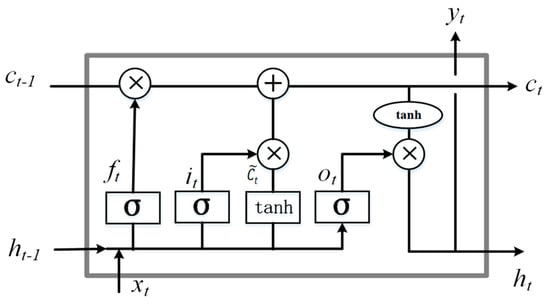 The LSTM model was first proposed in 1997. As shown in Figure 6, in LSTM, the hidden state in traditional RNN is replaced by the memory cell and three gates, i.e., the input gate , the forget gate , and the output gate . The output of the previous time step and the input sequence of the current time step are adopted as the input of the gates. The sigmoid activation function 𝜎 controls these gates : the information is preserved when the activation output is close to 1 and the information is eliminated when the activation output approaches 0. As for the memory cell , a candidate memory cell is computed at first. The only difference between and the gates are that utilizes a Tanh activation function ranging from −1 to 1. Finally, the memory cell is generated by combining and and then the previous memory cell with and , where decides how many data from are useful and decides how much information from the old memory cell is retained. The detailed formulas are presented as follows: