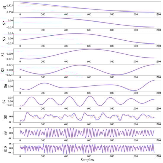 Once the optimal number of the decomposition layers is determined, the load demand data are decomposed by EWT to obtain the sub-components. Then, LSTM predictors are trained simultaneously to predict each sub-component. The predictions for the decomposed sublayers regarding the validation set are shown in Figure 9. The load demand is decomposed into sub-layers by the EWT, which provides the best performance of the selected datasets (). Sub-layers () capture the low-frequency oscillation of the baseline and the curves of these sub-layers vary smoothly and change steadily. The predicted curves of these four layers achieve higher accuracy from the prediction results. Because the Sub-layers () capture high-frequency components with a high fluctuation range and include the most noise, most of the prediction errors come from these components’ predictions.