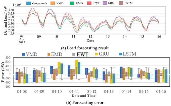 Day-ahead forecasting results on the distribution-level load. (a) Load demand profiles. (b) Load demand forecasting error.