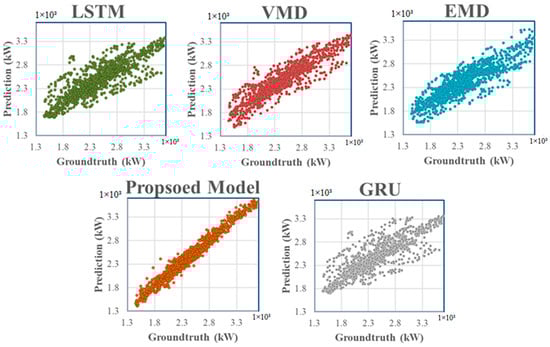 Figure 11 shows the scatter plot of different forecasting models’ ground truth and forecasting values. The scatter plot shows the correlation relationship between the two variables. The higher the value, the stronger the correlation between the predictions and ground truth, representing better accuracy achieved by the forecasting model. For the proposed model, the scatter about the line is relatively small and most of the points are on the regression line, with only several data values far from other data values. For other spectral methods, the of VMD-LSTM and EMD-LSTM models also show a strong correlation with the ground truth curve, with values over 0.70. CNN-GRU shows the worst correlation from the scatter plot, with values of 0.429.