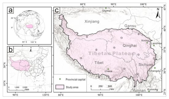 Location of the study area. (a) Location on the earth. (b) Location in China (source: GS(2020)4619). (c) Map of the study area: 1. Pamir Plateau; 2. Karakoram; 3. Himalaya; 4. Mt. Hengduan; 5. Mt. Min; 6. Mt. Qilian; 7. Mt. Altun; 8. Mt. Kunlun; 9. Qiangtang Plateau; 10. Gangdise; 11. Nyainqentanglha Range; 12. Qingnan Plateau; 13. Qaidam Basin; 14. Hoh Xil; and 15. South Tibet region.