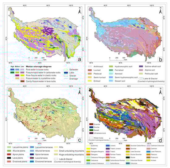 Modified maps for quantitative assessment of the TP. (a) Hydrology map of the TP, based on [66] (b) Pedology map of the TP, based on [67] (c) Landform map of the TP, based on [68], and (d) Geology map of the TP, based on [69].