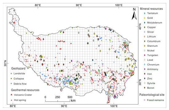 The geosites in this study consisted of mineral resources, fossil remains, volcanic craters, hot springs, landslides, collapses, and debris flow (Figure 3). The data of mineral resources in this paper were modified from the Distribution Map of Important Mineral Resources in China, which is a map containing the mega and most typical mineral resources in China. The original data sources of these seven components are shown in Table 2, and the data sources were separately obtained from the Institute of Mineral Resources (IMR) Chinese Academy of Geological Sciences, the GeoCloud online database of China Geological Survey, the New Geological Structure map of China in Geological Atlas of China [70], the Institute of Hydrogeology and Environmental Geology (IHEG) Chinese Academy of Geological Sciences [71], and China Institute of Geo-Environment Monitoring (CIGEM) [72], respectively.