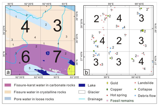 Examples of diversity scores; the large-size numbers are the diversity score for each grid, the small-size numbers show the process of element counting (a) Hydrology. (b) Geosites.