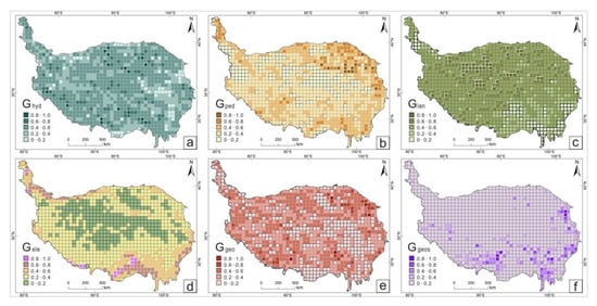 Each geo-group possesses different characteristics of diversity after normalization (Figure 5). The grids with Ghyd larger than 0.8 are more dispersed than the other geo-groups in the TP (Figure 5a). In the northern part of the study area, grids with Ghyd in the range of 0.8–1 surround the periphery of the Qaidam Basin, because the margin of the Qaidam Basin is the boundary zone between salt and fresh water. The high values of hydrological diversity (Ghyd > 0.8) in the south of the TP are concentrated in the western shore of the Yamzho Yumco Lake, the Egon region, and Ranwu Town, which are dense areas of rivers, lakes, and glaciers. Most areas with Ghyd lower than 0.2 are found in the Huangshui Valley and the Qingnan Plateau, where the groundwater is only fissure water. Figure 5b illustrates that the high values of soil diversity (Gped > 0.8) are concentrated in the northwest of the TP. The region of Duran County is the area with the highest pedological diversity. Most grids with low values of pedological diversity (Gped < 0.2) occur in the Karakorum and the Hoh Xil Nature Reserve, which are all desert soil and alpine soil.