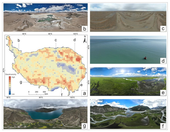 Zakharovskyi and Nemeth [75] presented the results of geodiversity assessment through photographic images of the landscape. Panoramic images taken by Unmanned Aerial Vehicle (UAV) were used to determine whether geodiversity can reflect the richness of the landscape. Figure 7a is the contour map processed by the inverse distance weighted (IDW) method for the spatial pattern of geodiversity. Six locations were sampled on the map, with two spots of low GI (Figure 7c,d), two spots of medium GI (Figure 7b,e), and two spots of high GI (Figure 7f,g). Figure 7c was shot in the Cold Lake area, the lowest value of geodiversity in the Qaidam Basin, where the landscape and soils are homogeneous, and the horizon is flat. In contrast, Figure 7d was recorded at the Qinghai Lake. Because the lake surface does not entirely enclose the grid, some of the abiotic elements around the lake enhance the GI of this area. Figure 7b was photographed in the plain between Mt. Kunlun and the Karakorum, and Figure 7e was captured in the Ruoergai wetland. The landscapes of both areas are very different, but the GI of both are similar. This illustrates the inability of geodiversity to define the type of landscape on the surface. Figure 7f,g are visually richer in the content of the combination of rivers, lakes, and steeper mountains. Figure 7f,g were captured in the north of Ranwu Town and on the western shore of the Yamzho Yumco Lake, respectively. Ranwu Town is in the grid with a high GI, while the Yamzho Yumco Lake is in the grid with a very high GI. The richness of the landscape is similar in both areas, although there exist differences in geodiversity. However, compared to the areas with low geodiversity (Figure 7c,d), there is a higher color and geometric richness. The value of GI can respond to the complexity of the surface landscape, but it is no longer obvious in the interval of higher geodiversity.