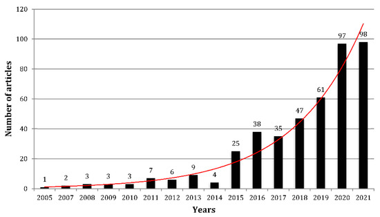 A performance analysis allows analytical descriptions of the contributions of the research elements that constitute the studied topic [32], in this case, the publication-related metrics of sustainable entrepreneurship will be depicted at the global level in order to contextualize this field of knowledge, then, we will focus on the Global South. Figure 2 shows how the 1964 articles that were produced from 2001 to November 2021 in the field of sustainable entrepreneurship are distributed. It is interesting to observe the growing scholarly research, mainly since 2015.