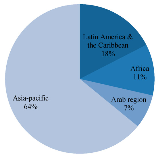 The remarkable difference between the number of articles that were produced by the Global North and the Global South indicates that developed countries dominate the field of sustainable entrepreneurship research. Then, we categorized the most productive countries of the Global South by regions. It is interesting to note that production in the Global South is concentrated in countries that are mainly located in the Asia–Pacific; this region has made the largest contribution to the field of sustainable entrepreneurship from the Global South. Figure 4 shows the distribution of articles on sustainable entrepreneurship by the Global South regions without Global North collaboration.