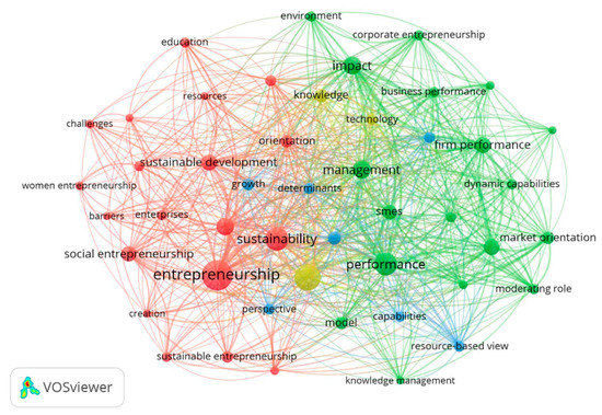 Finally, as part of this mapping research approach, we conducted a co-word analysis. This technique allows us to explore the relationships among topics in a research field based on the content of the publications. This analysis assumes that words that are frequently together keep a thematic relationship between them [32]. According to Donthu et al. [32], this analysis provides input in order to visualize the future of the studied field of knowledge. First, we selected those keywords from the Global South with a minimum occurrence of 10. Of the 1932 keywords, 50 met the threshold. Once we filtered some of the meaningless words, we used the Tesauro database to eliminate the duplicated words. A total of 47 keywords were grouped into 4 identified clusters. Then, we ran the same co-word analysis for the Global North. We selected those keywords with a minimum occurrence of 20. Of the 4612 keywords, 87 met the threshold. The criteria that were used to decide the minimum number of co-occurrences were the number of articles that were produced by the Global North and the Global South and the number of resultant keywords. Thus, considering the resultant differences between the Global South and the Global North, we maintained the proportion considering the total. Then, we filtered some of the meaningless words and used the Tesauro database to eliminate the duplicated words. A total of 77 keywords were grouped into 4 identified clusters. Figure 7 and Figure 8 show the co-word network clusters of the sustainable entrepreneurship literature in the Global South and the Global North. The top five words of each cluster are presented in Table 6.