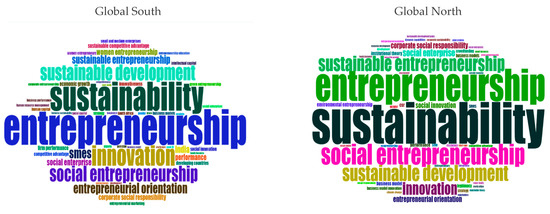 The analysis of these clouds confirms the earlier results. The topics related to sustainable entrepreneurship in the Global South and the Global North are addressed. However, sustainable entrepreneurship as a concept is higher in the Global North, while innovation is higher in the Global South. On the other hand, there seems to be some effort by the Global South to study topics that are related to their context, for instance, women’s entrepreneurship (confirmed by co-word analysis). Although it is not prominent yet, it seems that the Global South is beginning to address topics that are more relevant to the region.