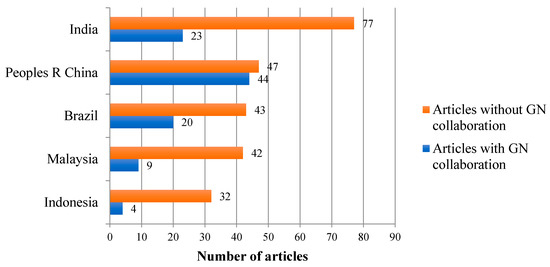 The top five articles that were published by the Global North and the Global South countries are presented in Figure 5. Notice that the most productive country of the Global South (India) does not reach the least productive level of the Global North (The Netherlands), showing the influence of the developed countries in this field of knowledge.