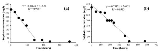 Sulfate reduction rate tests using the sludges of the (a) IWWTP and (b) DWWTP: reduction of sulfate concentration versus incubation time.