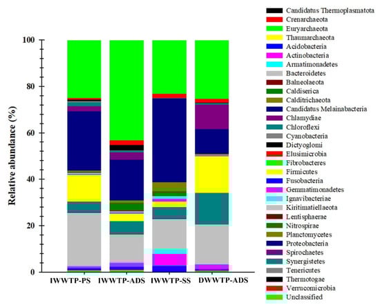 More than 34 prokaryotic phyla were detected in all the samples, as shown in Figure 6. Proteobacteria (10.6–36.1%), Bacteroides (11.7–22.6%), Firmicutes (2.2–15.7%), and Chloroflex (4.4–13.6%) were the core phyla, accounting for nearly 88% of the total sequences. IWWTP-SS had the highest relative abundance of Proteobacteria compared to IWWTP-PS, IWWTP-ADS, and DWWTP-ADS. In the sludge samples, three phyla (Euryarchaeota, Crenarchaeota, and Aigarchaeota) of archaea were discovered with a relative abundance of 2.4% (see Figure 6).