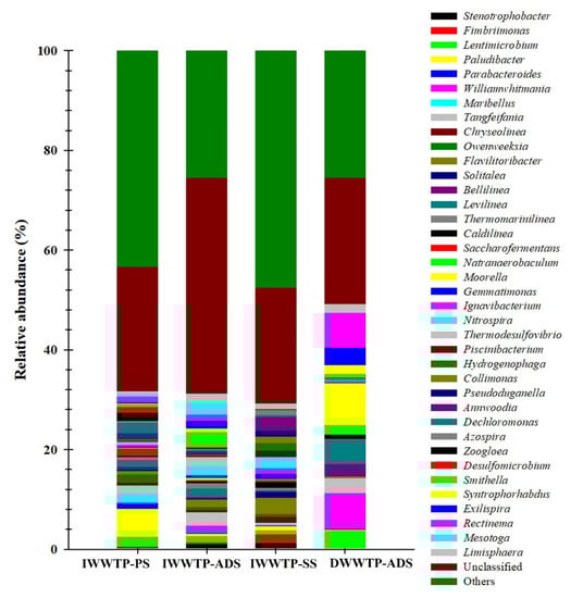 Bacteroidetes were abundant in the IWWTP-PS sample, while Firmicutes and Chloroflex were abundant in the DWWTP-ADS sample. Figure 7 shows microbial genera with an abundance of more than 1% in at least one sample. A total of 38 genera were identified, with the IWWTP-SS sludge sample accounting for 49% (most dominant) of the assigned sequences. The most abundant genera in the samples DWWTP-ADS, IWWTP-PS, IWWTP-ADS, and IWWTP-SS were Moorrella (8.44%), Paludibacter (5.66%), Tangfeifania (2.54%), and Flavilitoribacter (3.23%), respectively (Figure 7). However, unassigned ASVs were found in all samples in the range of 23.2–43%, and were relatively abundant in IWWTP-SS. Thus, the unassigned ASVs were linked to the differences in the microbial community structure found in this study. In wastewater treatment and biogas systems, Proteobacteria, which include various aerobic, anaerobic, and facultative bacteria with different metabolism types, are typically found in the highest abundance [31,32]. Phosphorus and nitrogen removal are generally beneficial to Bacteroidetes and are associated with the hydrolysis and acetogenesis of organic materials [33]. The abundance of archaea in anaerobic digesters was consistent with previous studies that found archaea to be one of the most prevalent phyla in anaerobic digesters [34].