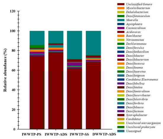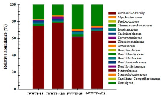 A total of 15 families in the samples were detected, and most ASVs belonged to Desulfobacteraceae, Desulfobulbaceae, Desulfomicrobiaceae, Syntrophobacteraceae, and Desulfovibrionaceae exhibiting more than 1% abundance. In the IWWTP-PS and IWWTP-SS samples, Desulfobulbaceae (2.12 and 3.37%) and Desulfomicrobiaceae (2.12 and 2.16%) were more abundant, whereas Syntrophobacteraceae (2.26 and 2.64%) was more abundant in IWWTP-SS and DWWTP-ADS samples, respectively. Desulfovibrionaceae (2.71%) was found at relatively high abundance in the IWWTP-ADS sludge samples (Figure 8). All these assigned 15 families were also linked to 28 different genera, with Syntrophobacter (0.79–2.64%), Desulfobulbus (1.48–2.92 %), Desulfovibrio (0.37–2.64%), and Desulfomicrobium (0.14–2.16%) being the most prevalent in the samples (Figure 9).