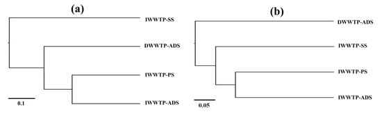 The raw sequences from Illumina MiSeq were assigned to samples on the basis of their unique barcode (demultiplexing) and truncated by cutting off the barcode and primer sequences using the Cutadapt (V1.9.1, http://cutadapt.readthedocs.io/en/stable/, accessed on 1 January 2021) tool. Next, quality filtering and denoising of the raw reads were performed under specific filtering conditions to obtain high-quality clean reads and merge pair-end sequences using the DADA2 plugin [25]. The amplicon sequence variants (ASVs) were resolved by removing chimeric sequences with a reference database (Silva database) on the basis of the “consensus” method. Subsequent analyses of richness indices (Chao 1 estimates), diversity indices (Shannon index), and Good’s coverage were performed. In addition, QIIME2 was used to evaluate the similarities in bacterial communities between the sludge samples using the unweighted pair group method with arithmetic mean (UPGMA) clustering based on a weighted UniFrac distance matrix. Finally, unassigned reads were grouped because they did not match any sequences in the database, whereas the reads showing below < 85% query coverage were grouped into an unclassified group. Phylogenetic analysis was performed using the sequence database obtained from National Center for Biotechnology Information (NCBI). Reads that did not match any sequence in the database were clustered into an unclassified group. Raw sequences of the SRA genes were submitted to the NCBI Sequence Read Archive database (reference no. PRJNA883522).