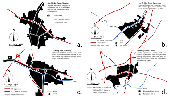 Typical spatial relationship between highway/expressways and towns. (a) Pass through, interfere local activities. (b) Parallel, town serves as rest stop. (c) Intersection within or near towns. (d) Intersection within or near small cities, interfere with local inter-town traffic.