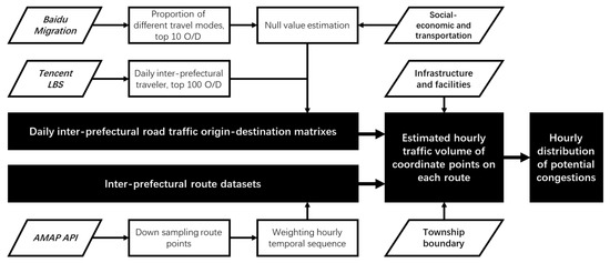 Our method generally includes three steps: (1) Generate a route dataset by preprocessing route recommendations from AMAP and join it with meaningful spatial units or objects. (2) Formulate an origin–destination matrix from Baidu and Tencent traveler data. (3) Anticipate possible congestion spot and time by allocating traffic load on a route to the spatial units it consists of.