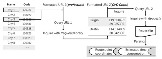 The AMAP API was used with Python 3.6 and Requests library for acquiring route recommendation data. AMAP is a major digital map and navigation services provider that was established in 2002, with a substantial market share in individual map services, taxi and delivery navigation, social network applications, etc. Any other providers of online navigation services are also applicable as the source of route-recommendation data, such as Google Maps, and those with open-source APIs are more convenient in use. As is demonstrated in Figure 4, given a destination, an origin, time of departure and route preference, it generates a route recommendation and the corresponding travel time and travel distance by exploiting basic geoinformation, crowdsourced incident reports, historic user data, etc. To acquire the information needed from the recommendation, the following steps are taken: