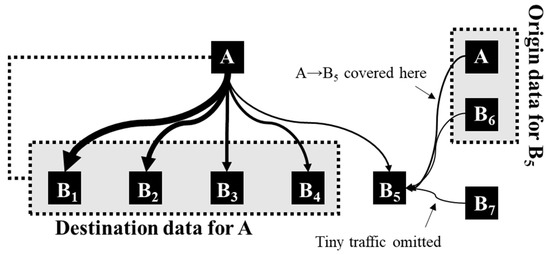 Explanation of how top 100 origin–destination data sufficiently represent traffic demands. ‘A’ represents a major city with large traffic volumes, and ‘B1’ to ’B7’ represents other prefectures. The direction of the arrow indicates the direction of traffic flow and the width of the arrow indicates the volume of the traffic flow.