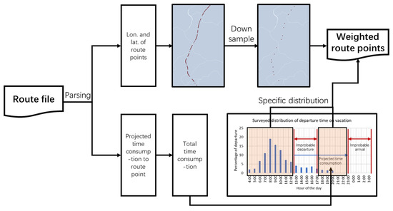 In correspondence, two measures are taken: (1) The coordinate points from the route files are down-sampled to a proper scale, at which the route is still sufficiently continuous, while the data volume would suffice hardware conditions. The ratio of down-sampling is determined by considering the potential spatial units that they are to be joined with. (2) The traffic load on each route is temporally allocated to its node, assuming that the hour at which the travelers depart obeys known distributions and satisfies basic preference for the time of arrival.