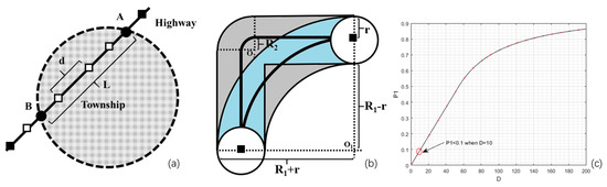 where in Scenario 1, is the possibility that the route goes into and out of a township from respective random points at minimum curvature, but no coordinate point falls in it; is the length of the highway that lies within the township (as is explained by Betrand’s Paradox, the probability distribution of the chord lengths in a circle is not a well-defined problem and leads to various different conclusions. Hence, in this study, we employed the simple version that it is linearly distributed); is the expected half distance between the centers of two neighboring townships; and is the expected half distance between two neighboring coordinate points. In this case, the township is much larger than the curvature radius, so curvature is neglected. In Scenario 2, is the possibility that it cannot be determined whether a given quarter turn goes through a nearby town center; is the maximum curvature radius of the turn; and is its minimum curvature radius, which we already know is 0.4 km. These two scenarios are typical negative consequences of the down-sampling process that we intend to avoid if possible.