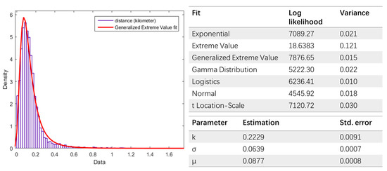 An unsampled route from Wuhan to Beijing, which contains 7529 coordinate points through Central and Northern China, was picked for discovering the distribution of neighboring coordinate point distance. The Generalized Extreme Value (GEV) distribution was presumed. The GEV represents the distribution of maximum or minimum values from independent distribution. This is close to the nature of distance values between consecutive navigation points: the distance between two checkpoints, such as turns, intersections, landmarks, etc., abides various distributions restricted by road engineering specifications or planning regulations; navigation points from digital maps are mostly set on these checkpoints, and the distances between consecutive navigation points is thus largely decided by the longest allowed distances of such checkpoints. Moreover, the GEV displays a better performance than other commonly used distribution functions (Figure 8). The fitted distribution is calculated as follows [21]: