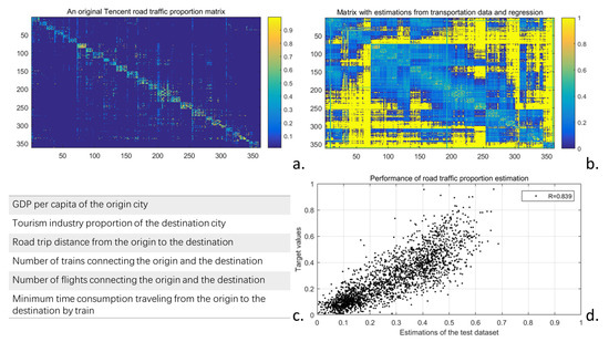 The road-traffic-proportion data only cover an average of about 2.5% in all city pairs for each single day; this is far from enough for the eventual prediction but adequate for modeling this proportion. In previous research [23], the transportation-mode choice of regional travelers was found to depend on various factors, including the purpose of the trip, the economic condition of the traveler, the time consumption of different modes, the departure and arrival hour, etc. Therefore, a property set is created for each city pair by (1) using methods in [24] to generate time consumptions and trip opportunities’ matrixes for all city pairs regarding feasible road, plane and rail routes; and (2) referring to statistical yearbooks to include the GDP per capita of the departure prefecture and the industry structure of the arrival prefecture, respectively, as a rough characterization of the economic capability and the purpose of travelers from the departure prefecture. Each of these properties is represented by a numeric matrix and reshaped to single columns to form the input dataset. Regression methods perform badly in regard to directly correlating the input and output variables, and scatter figures between these variables indicate a complex, possibly segmental relationship. Hence, a single-layer backpropagation network with 10 hidden neurons is trained by using the Levenberg–Marquardt algorithm. Moreover, prefecture pairs with no railway or flight connections are directly given the value 1. A result of the transformation is shown in Figure 9a,b; the variables used by and performance of the network are presented, respectively, in Figure 9c,d.