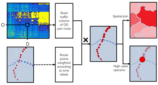 In Section 2.3.1, we estimated the spatial and temporal distribution of the traffic volume from one prefecture to another; in Section 2.3.2, we estimated the total traffic volume to be distributed. In this section, the traffic volumes of each prefecture pair are allocated spatially/temporally according to their distribution and overlaid with other prefecture pairs to evaluate the total traffic stress sometime and somewhere; potential hotspots are then spatially joined with meaningful POIs or administrative regions to provide policy implications. This process is elaborated as follows (Figure 10).