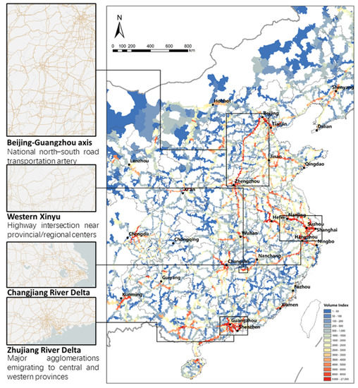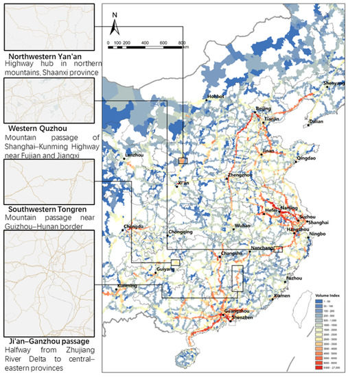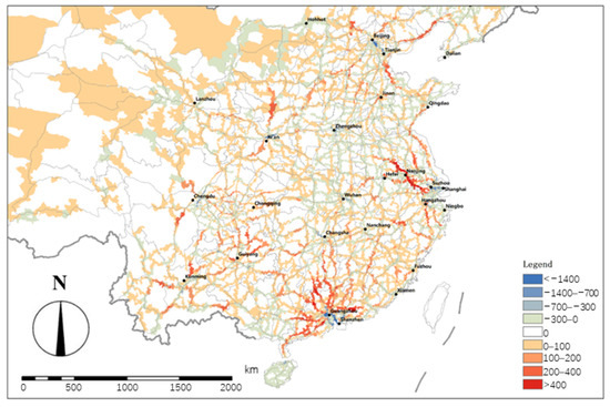 It is worth noting that, in Central and Northern China, the hinterland of China’s mainland highway network, there are many adjacent or closely parallel townships where the traffic volumes are anticipated to change in opposite ways. It indicates that, first, accurate characterization of the exact route is indeed necessary for anticipating potential congestions, especially with developed highway network and various alternatives for travelers going through the region; second, with proper guidance of passing traffic in advance, such a developed highway network can allow for more efficient exploitation of its capacity. A more explicit depiction of this change can be interpreted from Figure 13.