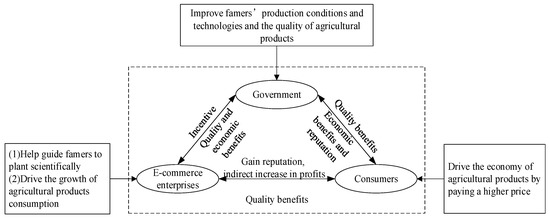 Here, we analyze the coordinated poverty alleviation mechanism composed of the government, e-commerce enterprises, and consumers. When the three parties reached a consensus on coordinated poverty alleviation, e-commerce enterprises and the government mainly focused on improving the production quality of agricultural products. E-commerce enterprises not only cooperated with the government to help farmers from the supply side but also cooperated with consumers to promote the increase in agricultural product income from the demand side. At this time, the interaction of the three parties not only played a role in poverty alleviation but also had positive benefits for the members, promoting their sustained, coordinated poverty alleviation. The collaborative mechanism of the e-commerce poverty alleviation system is shown in Figure 1.