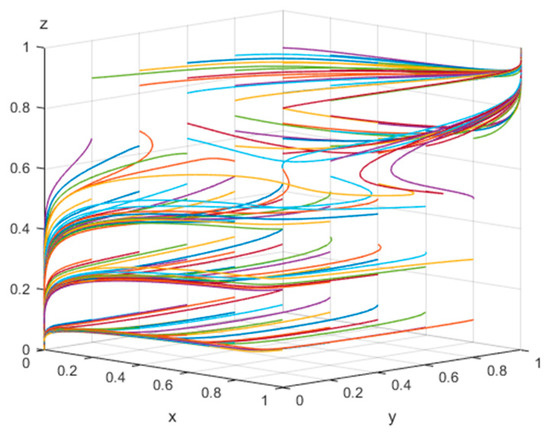 It can be seen that the parameter settings under this array meet the constraints of evolution equilibrium points and . By substituting the parameters set in the array into the game system to simulate the evolution path of the three parties, with the results of the evolution of the three parties shown in Figure 5, we can see that at this time, the system has two stable points of evolution equilibrium: and . That is, either the three parties choose to actively participate in helping farmers through cooperation, or none of them participate in helping farmers. Additionally, it can be seen that under the same parameter conditions, different initial probabilities of the three parties will lead to different evolutionary stability results.