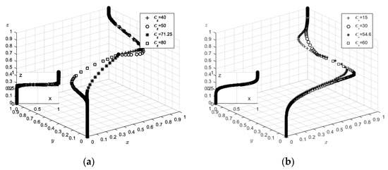 Figure 6b shows the simulation of the coordinated poverty alleviation strategy when the cost of e-commerce enterprises participating in poverty alleviation takes different values. It can be seen from Figure 6b that when the cost of e-commerce enterprises exceeds 54.6, the excessive costs will affect e-commerce enterprises’ poverty alleviation choices, causing e-commerce enterprises to gradually change from participation to no participation. Consumers’ behavioral strategies will also be affected, from “helping” to “no helping”, and the evolution strategy of the three parties will gradually change from to .