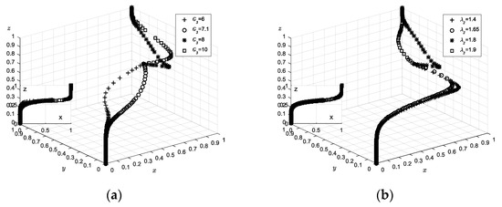 Figure 8 provides a simulation diagram of the evolution under the influence of consumer preference for helping farmers. From Figure 8a, it can be seen that the critical value of consumer preference for helping farmers changes between 0.24 and 0.88. When consumers’ preference for helping farmers and agriculture is lower than the critical value 0.24, regardless of the initial probability that the government chooses to vigorously implement poverty alleviation, the tripartite cooperative poverty alleviation tends toward . When the consumer’ preference for helping farmers is higher than the critical value 0.88, no matter whether the government and e-commerce platform choose the strategy of poverty alleviation, consumers will participate in helping farmers. Driven by the enthusiasm of consumers for helping farmers, the probability of government and e-commerce enterprises choosing “vigorously” and “participation” increases, and x, y, and z finally converge to 1.