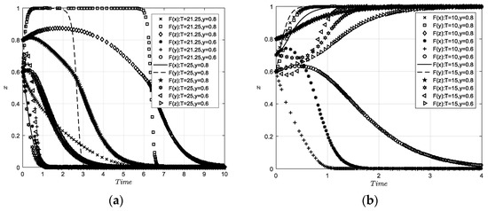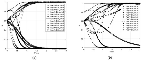 In order to analyze the impact of the government’s incentives for e-commerce enterprises to participate in poverty alleviation, we assign T to (21.25,25) and (10,15). It can be seen from Figure 10a that when T > 21.25, the probability of e-commerce enterprises choosing to participate in poverty alleviation gradually increases in the early stage, but with the decline in the probability of the government vigorously helping farmers, then the tripartite game gradually evolves to , and with the increase in the government’s incentives for e-commerce enterprises to participate in poverty alleviation, the speed of convergence to the three parties’ non-coordination is faster. At this time, the government passively helps farmers, and e-commerce enterprises and consumers do not participate in poverty alleviation activities, leading to the failure of farmers to solve their poverty relief tasks and the failure of rural economy development.