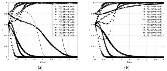 Figure 6 provides a simulation diagram of the evolution under the influence of an agricultural product premium. From Figure 9a, it can be seen that the critical value of the agricultural product premium changes between 4.6 and 7.8. When the agricultural product premium is lower than the critical value of 4.6, regardless of the probability of consumers choosing the “help” strategy at the initial stage, the tripartite cooperative poverty alleviation tends towards . When the premium of agricultural products is higher than the critical value of 7.8, the high agricultural premium will encourage e-commerce platforms and the government to choose poverty alleviation strategies in the short term. However, with the decline in the probability of consumers choosing the “no helping” strategy, x, y, and z eventually converge to 0.