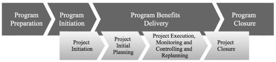 The Bosch–UMinho partnership recognizes the value of project management in supporting the successful running of the collaboration [47]. To this end, the two parties established a Governance Model based on a specifically developed management approach called the Program and Project Management (PgPM) approach [48], which was especially dedicated to Program and Project Management by R&D contracts in university–industry collaboration. Figure 1 illustrates the approach’s program management and project management lifecycles.