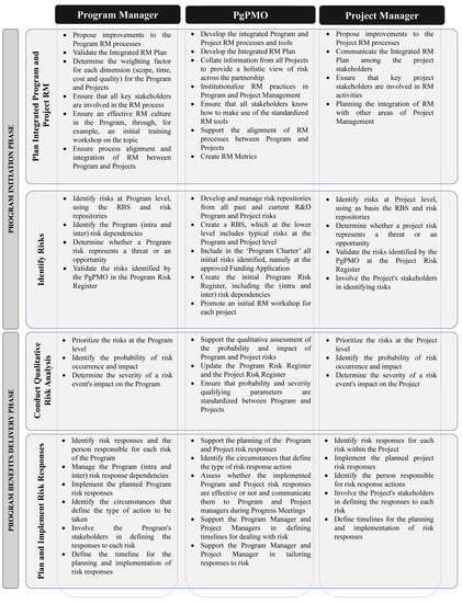 Consequently, the RM methodology developed and presented in this paper assumes the stakeholders’ perspective and identifies the main RM practices for the three main stakeholders involved in the RM process: the Program Manager, the Project Manager, and the Program and Project Management Officer. These three key roles are common in single organizations, but the role of the Program and Project Management Officer assumes an even more significant role in inter-organizational programs and projects [42].