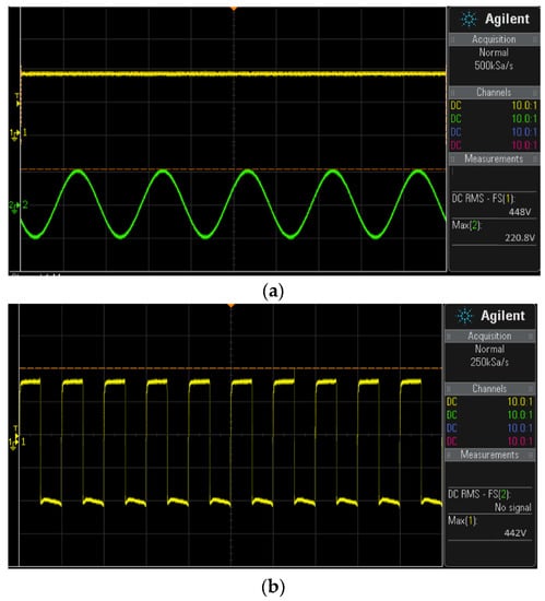 The high-frequency oscillation issue brought on by the transformer’s capacitances and the dual active bridge (DAB) converter’s high dv/dt increases in severity with higher switching speed. Theoretically, the zero crossing points of the DAB dv/dt excitation might be positioned at the oscillation frequency to solve the high-frequency oscillation problem. By connecting parallel capacitors to the power components, the DAB dv/dt is changed. The transformer’s reduced oscillation loss and superior soft-switching conditions not only solve the high-frequency oscillation issue, but also allow for an increase in efficiency. Short rise times can cause high dv/dt, which can cause voltage spikes and ringing on the voltage pulse’s leading edge. This ringing is a high-frequency EMI source, and if the peak voltage is sufficiently high, the voltage spikes could harm the loads. The resonant capacitor controls the dv/dt in the proposed converter, whereas the DAB only controls the dv/dt within its ZVS range and the dv/dt of the inverter is uncontrolled. Devices made of MV SiC can have uncontrolled dv/dt rates of up to 10–100 kV/s [60]. The dv/dt rate of 6.8 kV/us is validated by experimental data using a 344 Vac 10.4 A load current. The dv/dt analysis is shown in Figure 24.