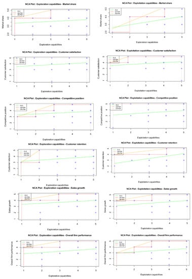 In the case of exploitation, the result showed that this capability is not a necessary condition for competitive position, while for customer satisfaction, the effect of the necessity of exploitation should be considered insignificant (d(CE_FDH = 0.063, p = 0.004). The strongest constraint is market share (d(CE_FDH) = 0.417, p = 0.034). This is followed by customer retention (p = 0.000) and overall firm performance (p = 0.026) (d(CE_FDH) = 0.188) and sales growth (d(CE_FDH) = 0.125, p = 0.000). In summary, exploitation is a necessary (but not sufficient) condition in four dimensions of business performance, i.e., market share, customer retention, overall firm performance, and sales growth.