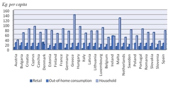 - Statista. Annual Household Food Waste Produced per Capita in Selected Countries in Europe as of 2020. Available online: https://www.statista.com/statistics/1219830/per-capita-food-waste-of-selected-countries-in-europe/ (accessed on 16 June 2022).