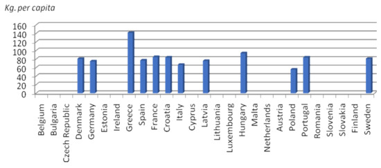 - Generation of municipal waste per capita—expressed in Kg per capita—it indicates the quantity of waste collected from the territory of a municipality and managed through the waste management system. Waste produced by residents, commerce, offices, and public institutions is included here. This category does not include industrial waste and waste resulting from agricultural activity. Figure 2 exemplifies the per capita distribution of municipal waste in EU countries.