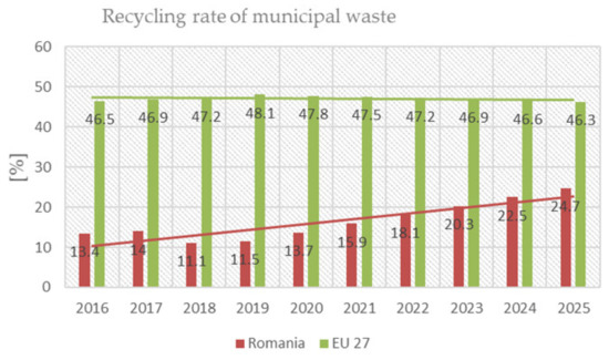 - according to Table 4, for this indicator, Romania is far above the European average and the situation is similar in the case of all emerging countries whose GDP per capita is low. Poland, to take the previous example, has values between 184 in 2010 and 169 kg per thousand euro in 2018 [53], while having a higher GDP than Romania. At the same time, the indicator has decreasing values for Romania, which indicates a favorable economic evolution and a certain control over the amount of waste generated. According to the 2018 data, Romania ranks 24th, followed by Poland, Bulgaria and Estonia. From our point of view, this indicator that reports the amount of waste to the GDP is not relevant from the EC’s point of view.