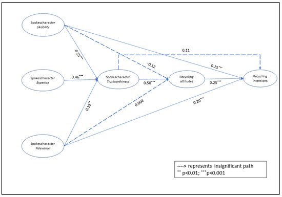 It was also found that spokescharacter trustworthiness fully mediated the effect of spokescharacter traits such as expertise, likability, and relevance on recycling attitudes, in line with existing spokescharacter research [21]. Additionally, spokescharacter likability exerted direct, positive influence on recycling intentions. The finding that spokescharacter likability exerted both direct and indirect positive influence (through trustworthiness and recycling attitudes) on recycling intentions, is consistent with the extant literature [22,24]. However, spokescharacter trustworthiness influenced recycling intentions only through recycling attitudes. A possible explanation of this finding can be that in the recycling literature, attitude towards recycling is shown to be an important predictor of recycling intentions [57]. As per The Theory of Planned Behavior, behavioral beliefs play an important role in the formation of attitude towards behavior, which then leads to behavioral intentions [55]. Additionally, source credibility research suggests that a credible source is perceived by the audience to possess requisite knowledge and experience and thus appear believable [18]. Thus, in our study, the exposure to trustworthy spokescharacters in the recycling message positively influenced recycling beliefs (as spokescharacters appeared believable in stating that recycling is beneficial), resulting in the formation of favorable recycling attitudes, and subsequently influencing recycling intentions.