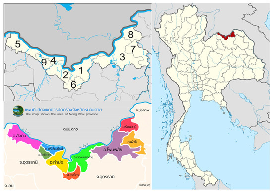 Number 5 is Baan Maung Nong Khai, Sangkhom District, Norng Kai Province, northeast of Thailand. (Source: Photos adopted with modification from: (1) Norng Khai province https://en.m.wikipedia.org/wiki/Nong_Khai_province, accessed 18 December 2022; (2) The area of Norng Kai province https://sites.google.com/site/nongkhaiprovince/kar-pkkhrxng-swn-phumiphakh, accessed on 18 December 2022; (3) Basic information of Norng Kai province https://www.asean-tech.ac.th, accessed on 18 December 2022). Note: (1) Mueang Nong Khai; (2) Tha Bo; (3) Phon Phisai; (4) Si Chiang Mai; (5) Sangkhom; (6) Sakhrai; (7) Fao Rai; (8) Rattanawapi; (9) Pho Tak.